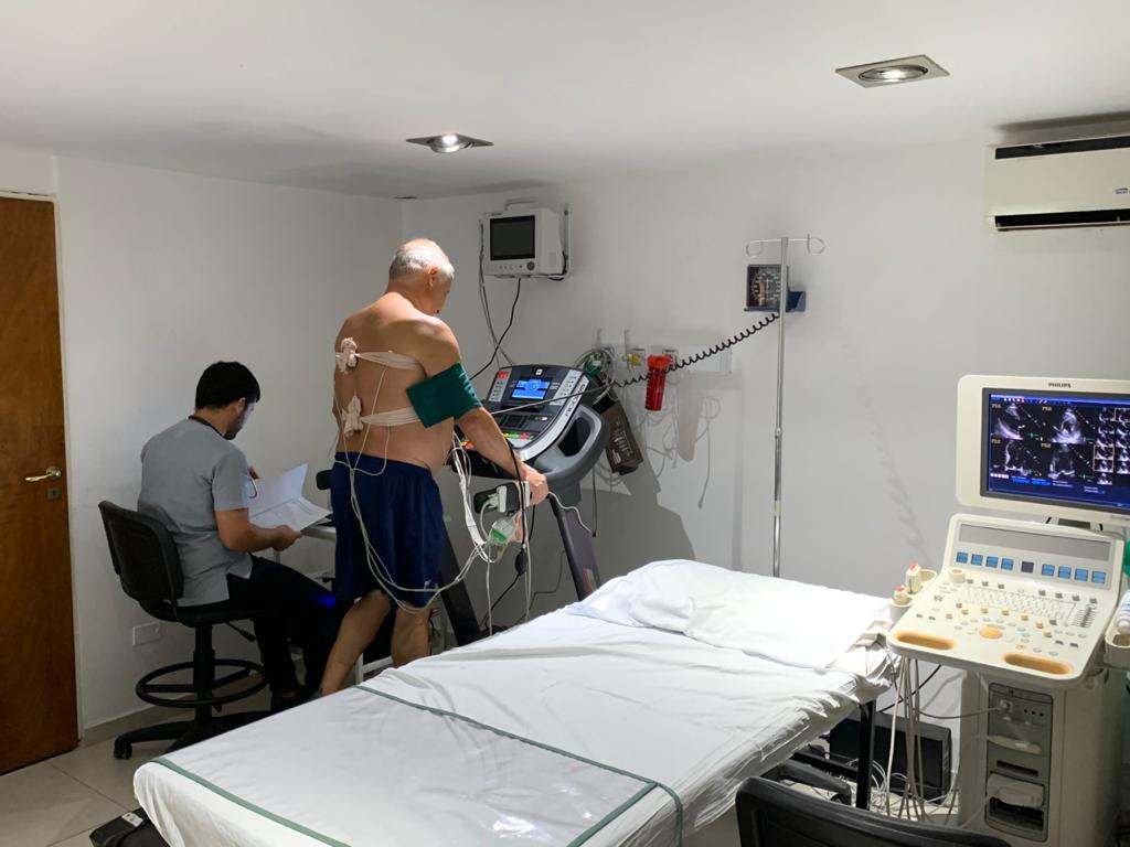 Eco Estrés con Ejercicio: Es un estudio que evalúa el corazón en situación de reposo e inmediatamente después del ejercicio, y compara las imágenes obtenidas para objetivar cambios en la contracción de las paredes (útil en pacientes con dolor precordial en estudio, enfermedad coronaria conocida – angioplastia, infarto, cirugía de by pass, hipertensión arterial, por ej) o cambios en el comportamiento de las válvulas (estenosis aórtica, insuficiencias mitral o aórtica) y en la presión de la arteria pulmonar.